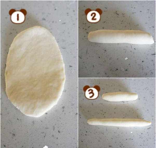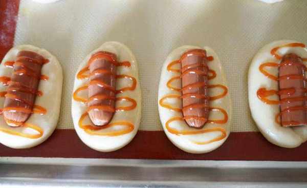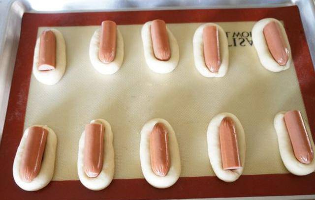 面团对折,两端捏紧,形成一个椭圆型,在中心摆上切对半的热狗↓↓↓