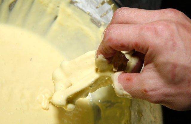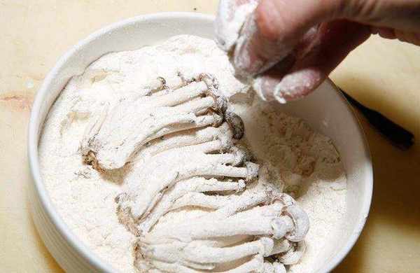 柳松菇先用手拔分为34小段,然后从头到尾都沾裹面粉。取奶、鸡蛋、1/3的天妇罗炸粉搅拌均匀。