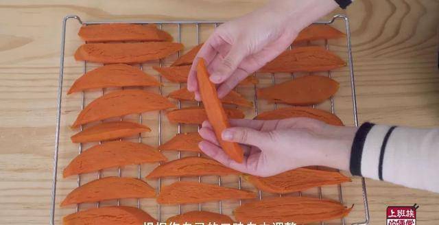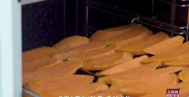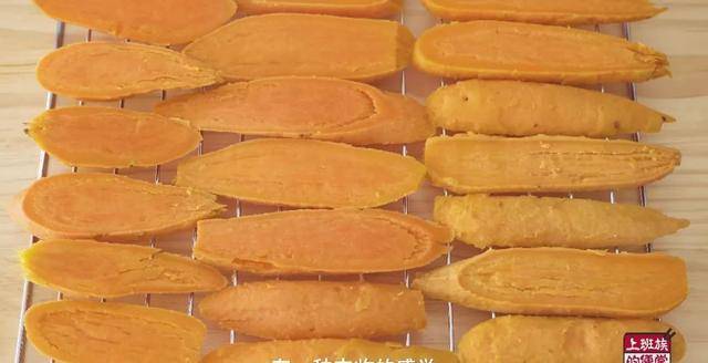 稍微放凉以后把皮剥掉,再切成1厘米左右的厚片,一块红薯切个4-5片差不多;我用的是烤箱的烤网可以上下透风,把红薯一片片摆上去。