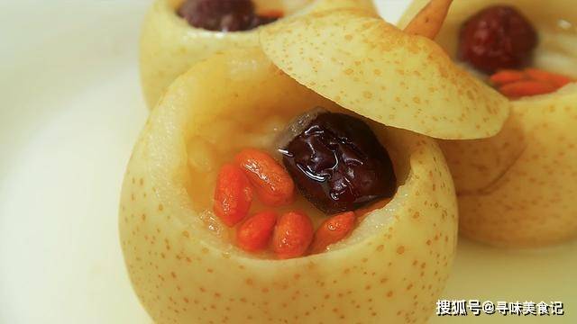 将梨子中间掏空,在里面放入红枣和枸杞,放在锅中炖15分钟,起锅后味道清甜,果肉细腻,吃起来很甘甜,可以润肺止咳。