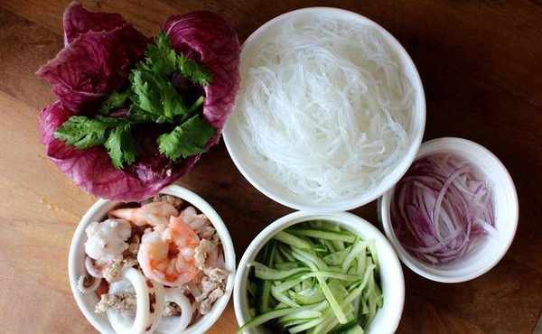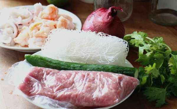 材料:鲜虾、花枝、猪绞肉、冬粉、紫洋葱、小黄瓜、生菜、香菜、麻油、盐、鱼露、柑橘醋、柠檬汁、泰式甜辣酱、蒜泥、香菜末
