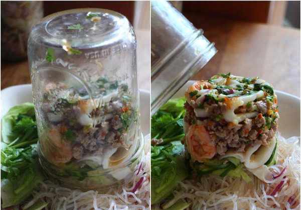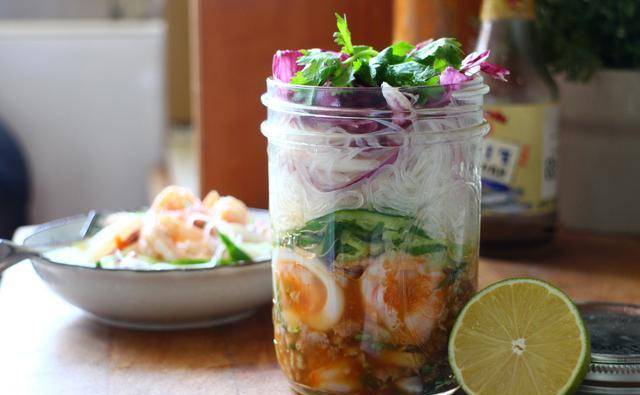 将粉丝放入瓶罐最上方,再放些生菜和香菜,盖上瓶盖即完成。酱汁沉在底部,不用担心冬粉浸太久发胀失去口感,所以可以提早一天做好冰在冰箱里。