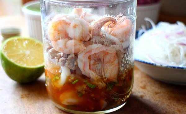 在玻璃罐中放入调好的酱汁搅拌均匀,再依序装进虾子、花枝、猪肉,再叠上小黄瓜。