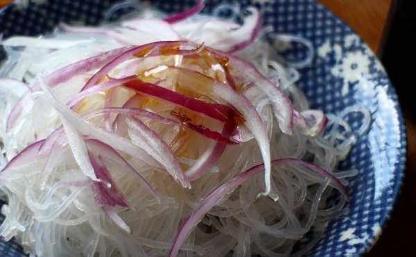 泡软的冬粉稍微剪短,加上紫洋葱丝拌入少许麻油。