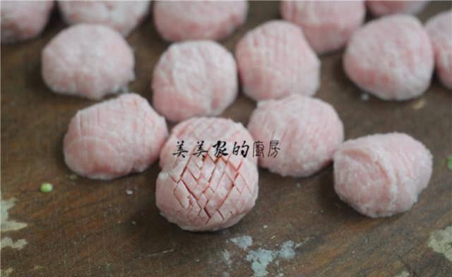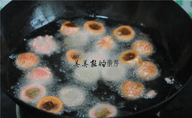 把切好的牛丸放到加热到160度的油锅里,炸到表面的十字花炸开,微微焦黄后捞出来。