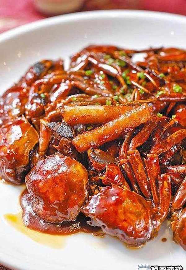 材料:小型大闸蟹(约1.5两)5只、辣油5大匙、辣豆瓣酱3大匙、洋葱丝1/4颗、糖2大匙、蒸鱼酱油2大匙、花椒油1大匙、面粉少许。
