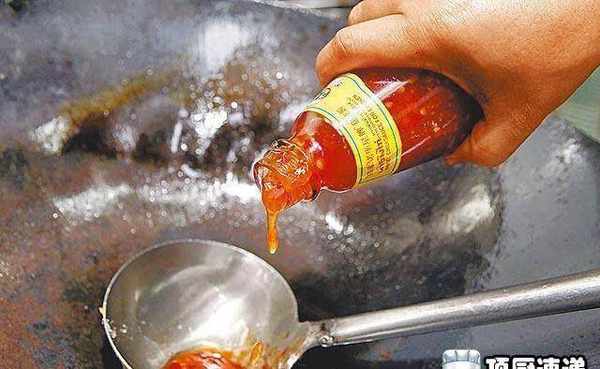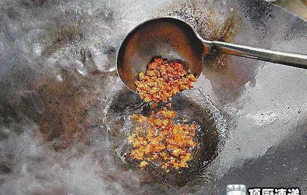 2、炒酱:以辣油将辣豆瓣酱炒香,下洋葱炒香,加糖调味。