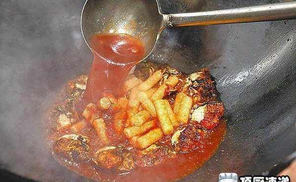 1、调酱:爆香蒜末,加烧鸡酱、糖、白醋、番茄酱煮匀,放入大闸蟹。