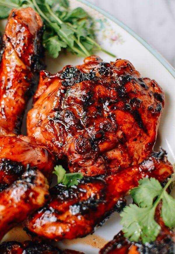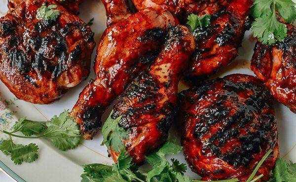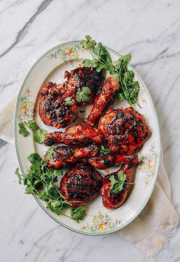 5.继续烤制,知道鸡肉被完全的烤熟了。之后把鸡肉放在一个大盘子里,如果还有酱汁没用完的话,直接涂在上面。或者烤盘里面有酱汁的话,也可以浇在鸡肉上面。准备好之后就可以上桌啦~