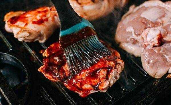 4.把二分之一的烧烤酱放在一个小碗里,备用。把剩下的酱汁涂在鸡肉上…
