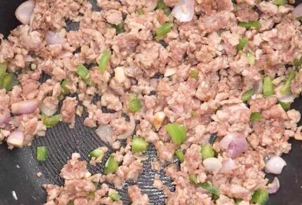 Step3.青椒切粒,干葱撕开成小瓣。Step4.咸鱼粒下镬煎香,加入蒜蓉、干葱及青椒粒炒香,再放猪肉炒匀。