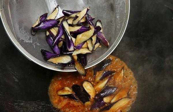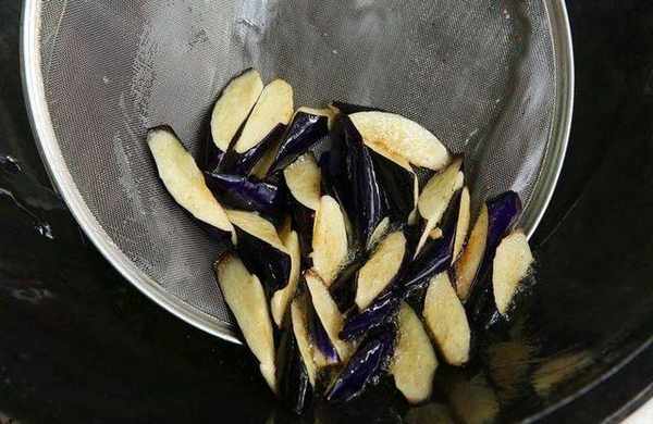 Step2:起一油炸锅,放入茄子炸至外观变色即可捞起、沥油备用。