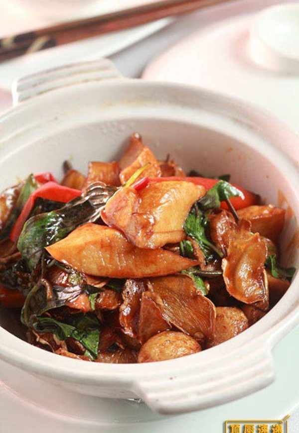 杏鲍菇300克、老姜片1条量、辣椒1条、蒜头10~12粒、九层塔适量