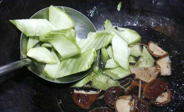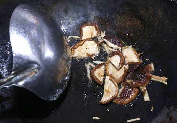 将嫩姜切成细段后,先用中火爆香约10秒。再加入香菇,与嫩姜一起炒至香味飘出。
