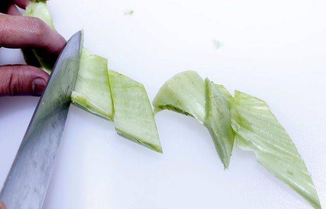 将长年菜清净,去除叶子、只留茎,并将茎切成长约5公分长段,先在滚水中加少许盐,再把长年菜放入汆烫约5分钟,捞起备用。
