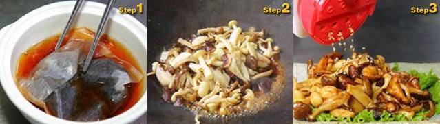 取一炒锅,加入50c.c.茶汁、所有的菇拌炒、焖煮约20秒入味,再加入糖、酱油、梅林调味、拌匀后起锅。