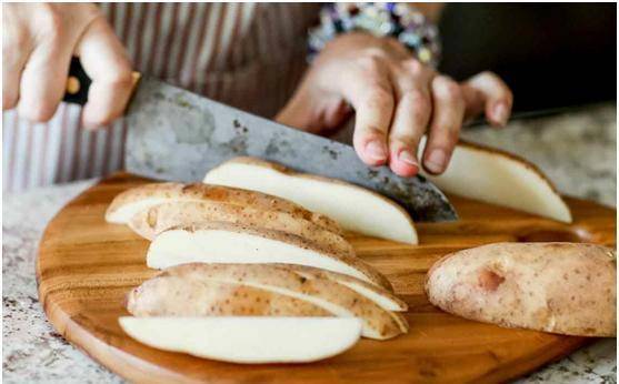 第一步:浸泡土豆,将土豆擦干净,然后将它们切成很长条。如果需要,将它们浸泡在一碗冰水中至少一小时。