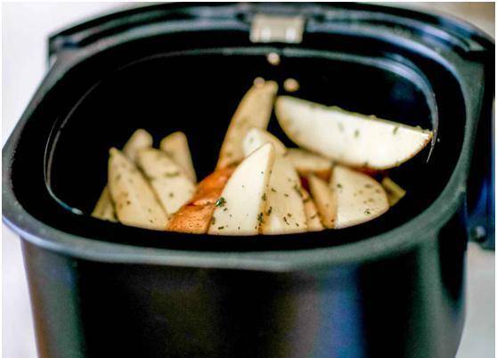 第四步:取出空气炸锅篮,加入土豆,尽可能均匀地放置。将计时器设置为10分钟并炸土豆。