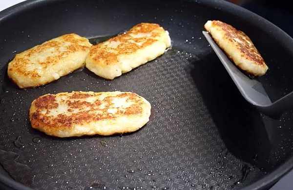 5、取平底锅,下适量油热锅,放入薯饼香煎,煎至两面金黄酥脆即可。