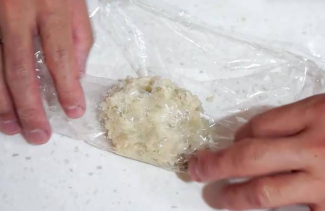 4、取保鲜膜(帮助塑形),放上适量马铃薯,压成薯饼的形状。薯泥可以直接用保鲜膜包起,冷冻保存1个月,需要时随时取出加热烹调。