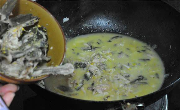 随着煮的时间越长,鱼身上的肉有点一碰就散的感觉了,用筷子夹起鱼头在汤汁中轻轻漂洗,让鱼身上的肉全部都散落在汤汁中,刺洗干净后就可以丢弃不要了,仔细将汤汁中的鱼刺打捞干净。