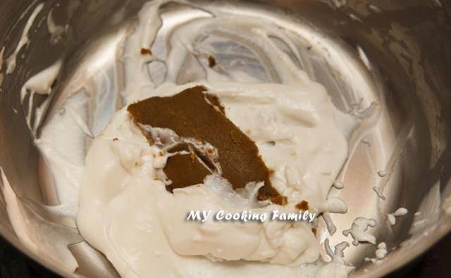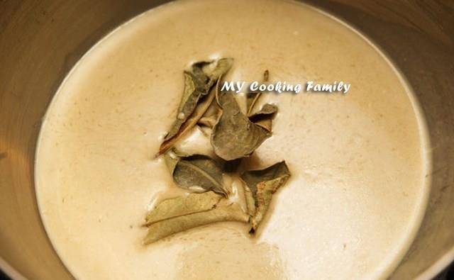 STEP3.趁着鸡肉在烤的时间,我们将椰奶下锅炒至油水分离后加入绿咖喱酱炒香。