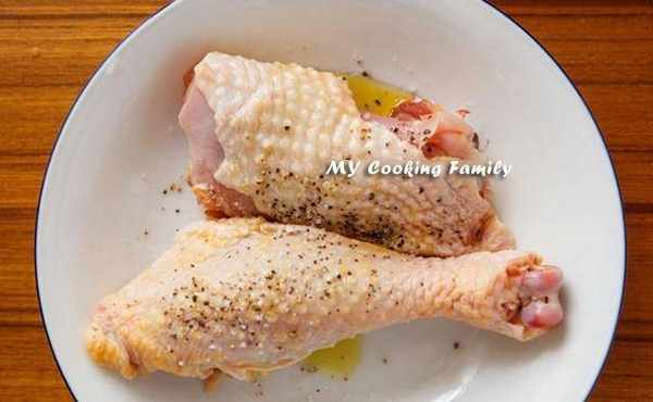STEP1.首先把鸡腿肉用橄榄油、盐和黑胡椒均匀涂抹。