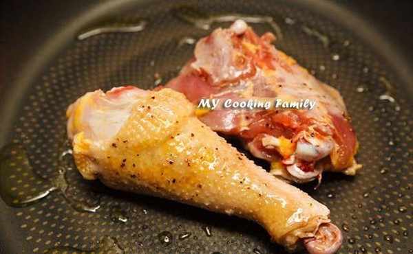 STEP2.接着将鸡肉用平底锅煎到表皮金黄后送进烤箱用200度烤约25分钟。