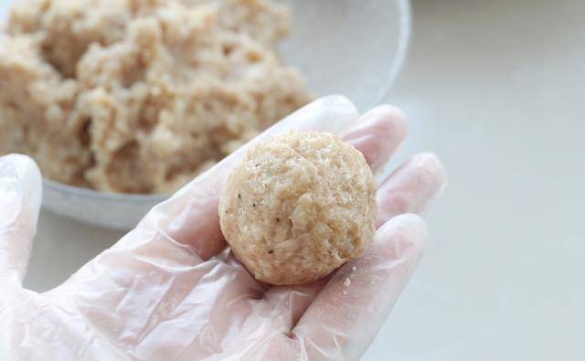 5、取35克左右的馅料用左右手交替来回摔打,使肉糜更有筋性,然后揉搓成圆球状。我一共做了十个丸子,代表十全十美。