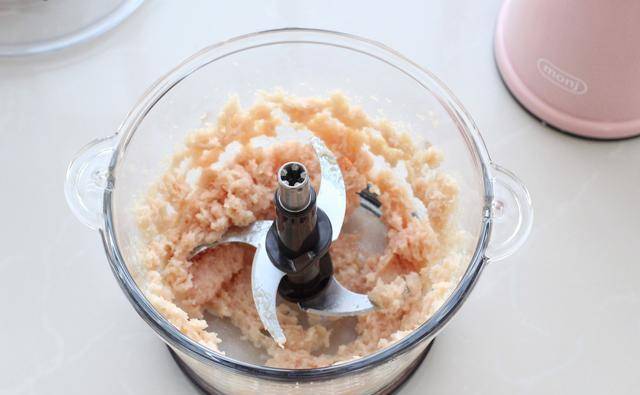 2、把它放在烹饪机里,把它打成碎肉,这样鸡胸就粘了,不易碎。