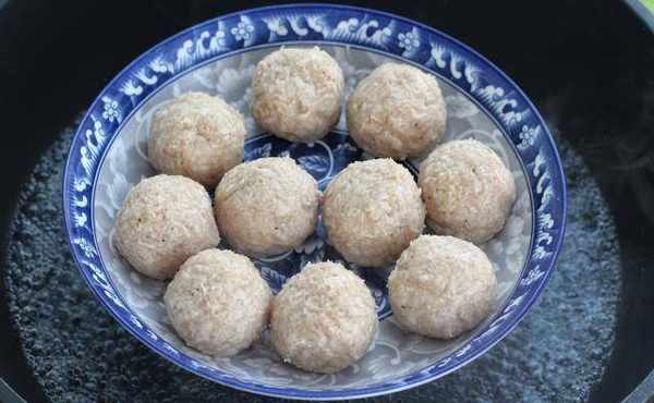 6、锅中加入水,煮至沸腾。把丸子球在锅里蒸10-12分钟.