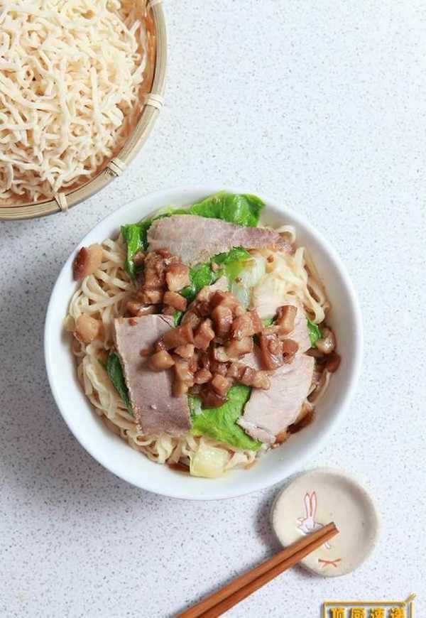 将意面放入滚水汆烫约1分钟捞起沥干、置于碗中,铺上小白菜与猪肉片,淋上适量肉燥即可。
