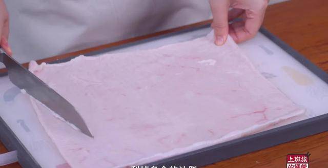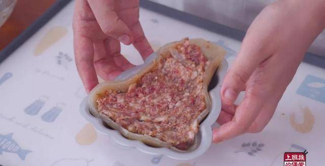 猪皮比划着模具切成同等大小,打底铺在熊掌模具上,抹一层肉馅,再按脚趾的位置依次放上牛筋,最后用肉馅填满整个掌心。