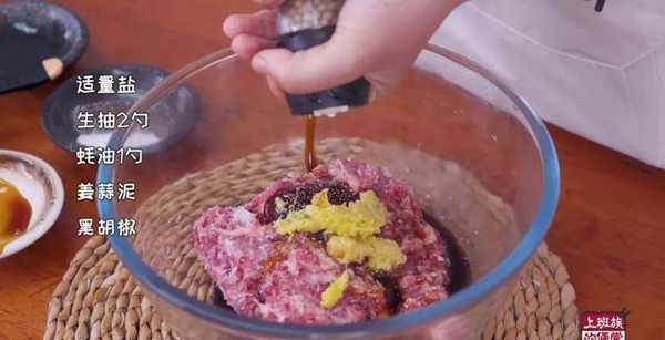 肉馅里面加入适量盐、2勺生抽、1勺蚝油、姜蒜泥和黑胡椒粉,揉搓抓匀。