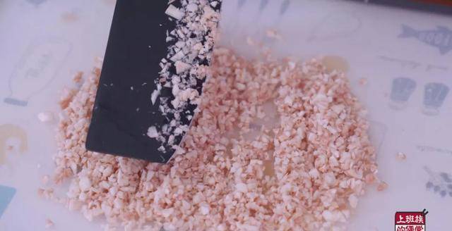 再搭配鲜掉眉毛掐得出水的口蘑,剁碎。