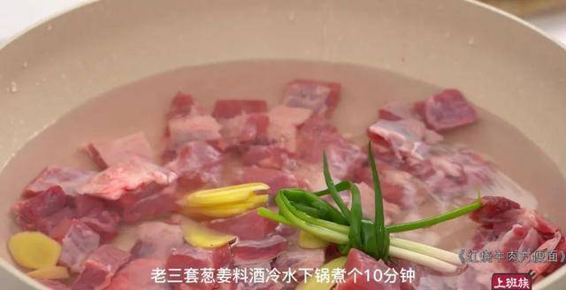 牛腩先来焯下水,老三套,葱姜料酒冷水下锅。