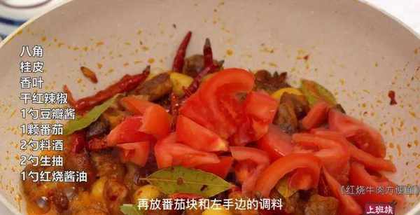 另起锅葱姜蒜爆香后下牛肉炒到有点焦黄色,加香料和豆瓣酱炒出香味,再放番茄块和左手边的调料,拌一拌。