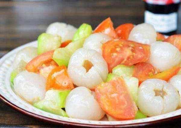 所需材料:荔枝、丝瓜、西红柿、食盐、植物油