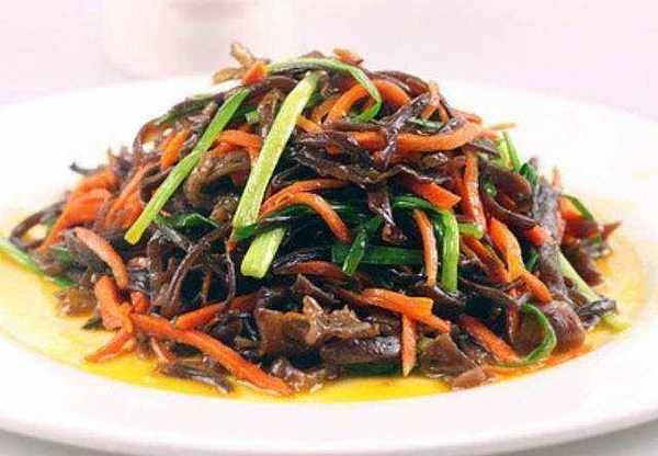 炒锅烧热下植物油,油7成热时下入胡萝卜丝翻炒一会,再下入黑木耳丝翻炒1分钟左右;
