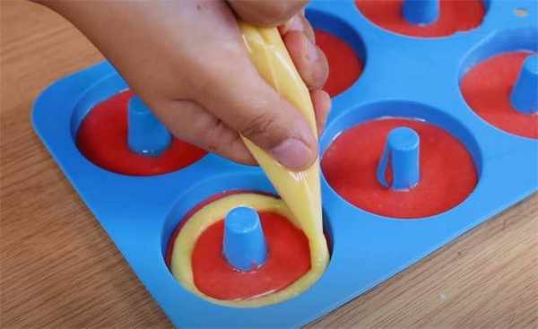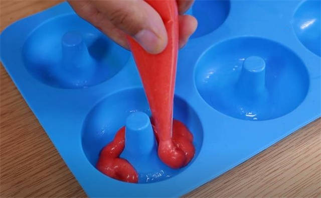 4.再准备一个做甜甜圈的模具,薄薄的涂上一层油,挤面糊的时候我们可以借助裱花袋,底面先铺一层红色的打底。