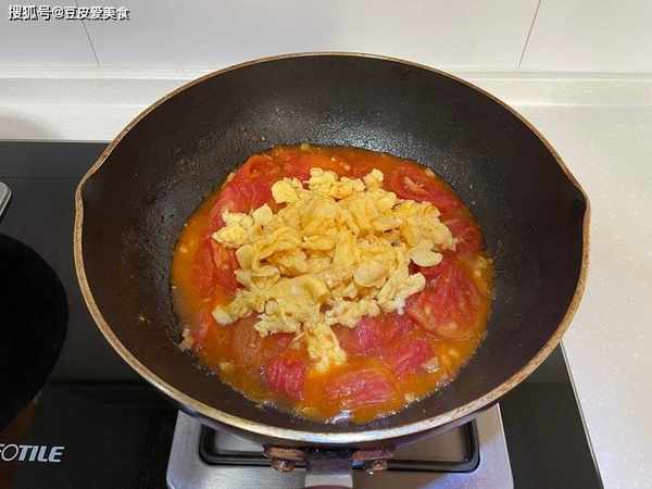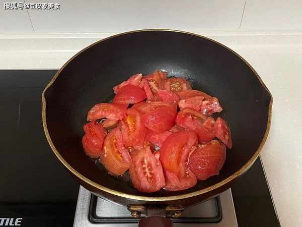 4、另起油锅,开小火,下入蒜末爆香,下入西红柿块,中火快速翻炒出汤汁。