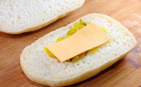 将拖鞋面包对半切开,底层面包中间涂上酸黄瓜,起司片切半,分别放在2片切开的面包上,备用。