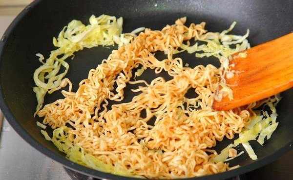 续加入步骤1的泡面翻炒约1分钟后倒入调味粉拌匀,盛盘备用。