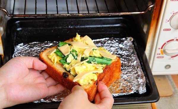 在土司上面摆好材料,也就是刚刚炒好的蔬菜蛋,还有1片起士。
