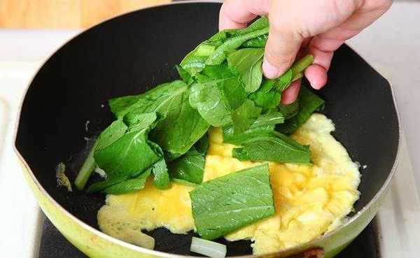 鸡蛋打成蛋液,小火下锅油煎成炒蛋,放入刚刚切好的油菜,拌炒均匀,并加入少许盐巴调味。