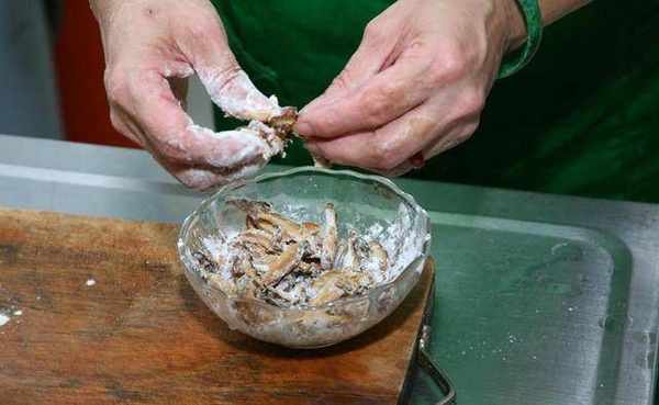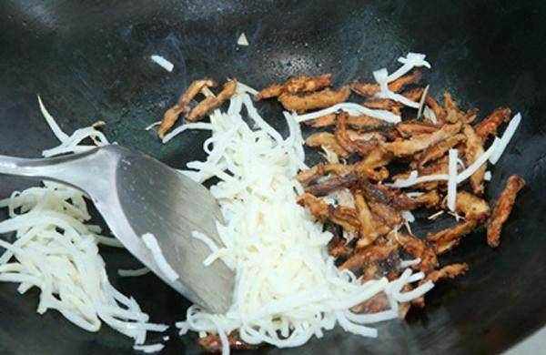 香菇切丝,加点日式酱油露腌10分钟。将腌好的香菇丝蘸裹面粉,放入摄氏100度的油锅以小火炸至呈金黄色。