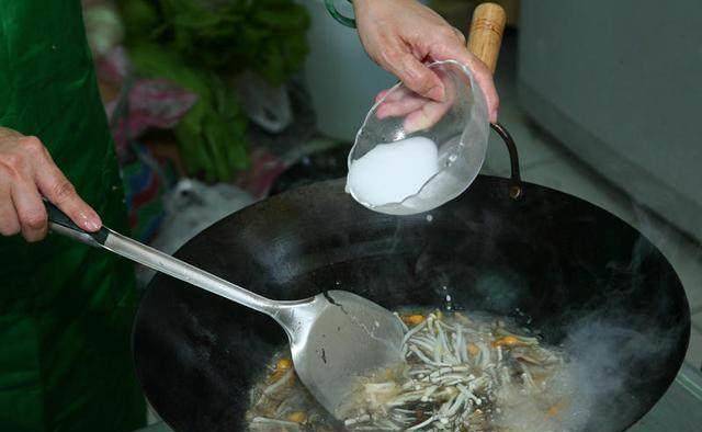 最后下金针菇略为拌煮。起锅前以太白粉水勾芡,并以盐、乌醋调味,再淋一点酱油增添香味,即可完成。