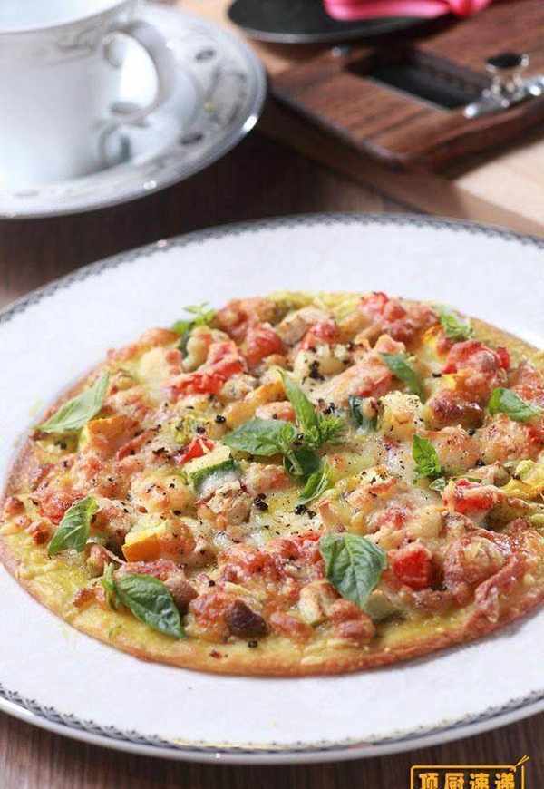 放入烤箱,上下火均210℃烤6分钟,出炉后撒上罗勒叶,初榨橄榄油5c.c.均匀淋于披萨即完成。