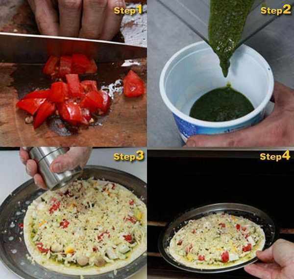 市售直径约20公分披萨饼皮1片、披萨起司50克、帕玛森起司15克、美白菇20克、鸿喜菇20克、杏鲍菇20克、绿栉瓜40克、黄栉瓜40克、牛番茄80克、罗勒叶8片、九层塔20克、杏仁5克、蒜泥5克、柠檬1/6颗、初榨橄榄油35c.c.