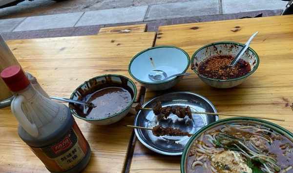萬豐是很多老昆明人的心頭好,大家從小吃到大,承載了一代昆明人的記憶,雖然如今擴張了,開了很多分店,但是小西門店就一直在這裡,連煮粉的阿姨也還是熟悉的面孔,有人還說連服務都是一樣差,呈現了雲南風味的一派傳承景象。桌子上還有辣椒油和醬料,喜歡吃辣的可以加辣椒油,那個醬料一定要放,是小鍋米線的精髓所在,一碗沒幾下就被吃貨們舀光,很受大家的歡迎。